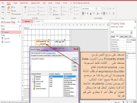 نضغط على مربع النص ثم من Property sheet ومن التبويب Data نضغط على ... الثلاث نقاط الموجودة بجوار control source لنفتح expression builder ثم نكتب الدالة count بلا أي شروط كما هو موضح وذلك لمعرفة جميع أعداد الطلاب الموجودين بجدول students ,نلاحظ أننا قمنا باختيار الحقل id هنا ويمكن اختيار أي حقل آخر لا يحتوي على قيم فارغة.